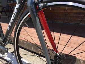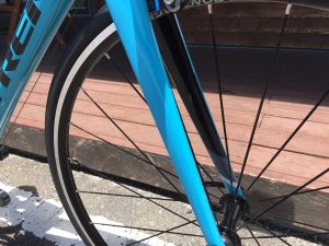 フロントフォークはカーボン素材を採用(アルミコラム)で軽さと振動吸収性を高めています。