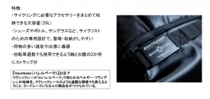 サイクリングに必要なアクセサリーをまとめて収納でき、大容量(29L)バックで、シューズやボトル、サングラスなど、サイクリストののための専用設計で、整理・収納がしやすいバックです。