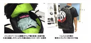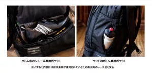シューズやヘルメット、ボトルなどが個別で収納できるので、両手が塞がることもなく自転車を降りての移動も楽々♪