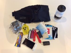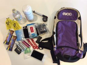 飲み物、補給食、サスペンションポンプ、パンク修理キット(レバー、チューブ、CO2ボンベ、)、携帯ツール、アーレンキーセット、ムヒ、サビオ、ティッシュ、ハンドタオル、ウェットティッシュ、携帯、車の鍵、これらを10Lのバックパックに入れて走っています。