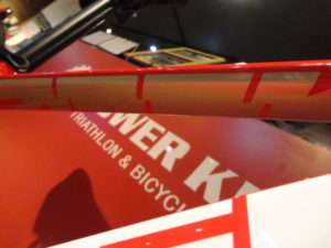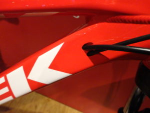 ダウンチューブのTREKロゴがトップチューブ裏で反射しているように見えます。