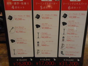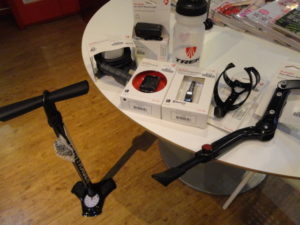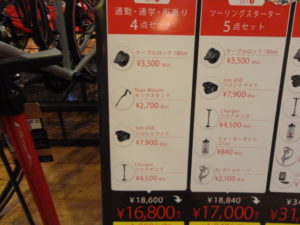 こちらはキーロック・フロントライト・空気入れ・ボトル・ボトルケージ・サイクルコンピュータ/センサーの6点セットです。