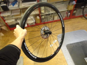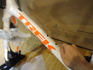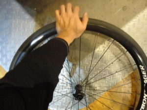 (ホイールやサドル、シートマストも光に当てて傷、異常が無いか確認します。)