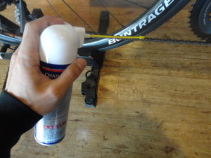 まずはチェーンにスプレーしたら、付属のブラシで軽くこすります。