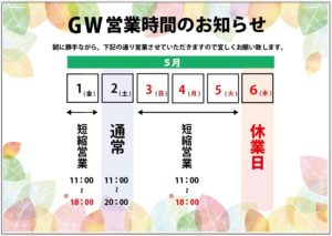 5/1(金)、3(日)、4(月)、5(火)は短縮営業(11:00~18:00)