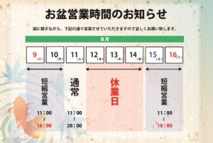 8/12(水)、13(木)、14(金)は休業日とさせていただきます。