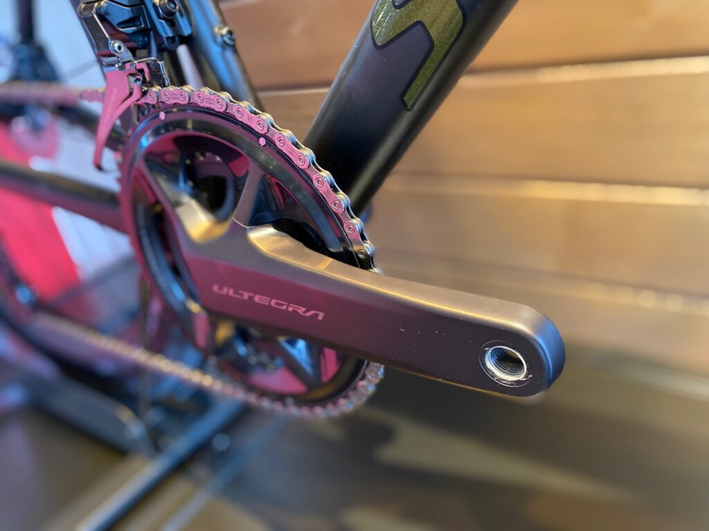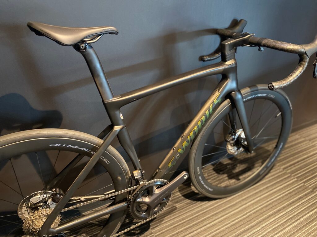 そんな最軽量で最速なフレームに最新の12速セミワイヤレス電動ギアとエアロホイールを搭載した車体に仕上げました。