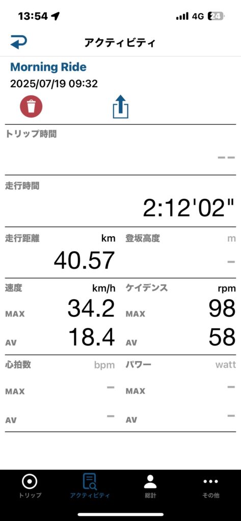 サイクリングロードではケイデンス75〜85、スピード25〜30kmを意識して走行。