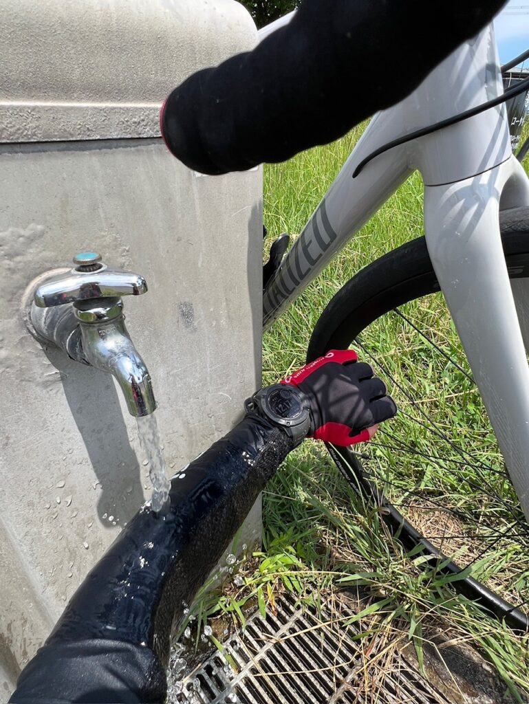 暑さ対策として多めの水分補給と、アームカバーを濡らして気化熱を発生させ冷却効果。