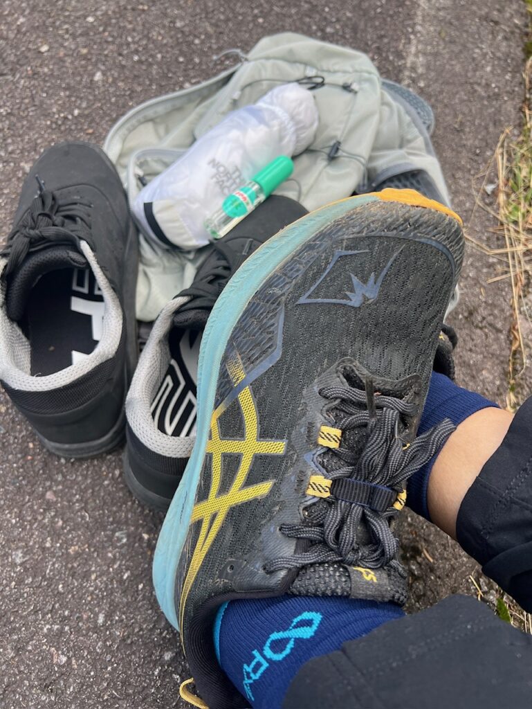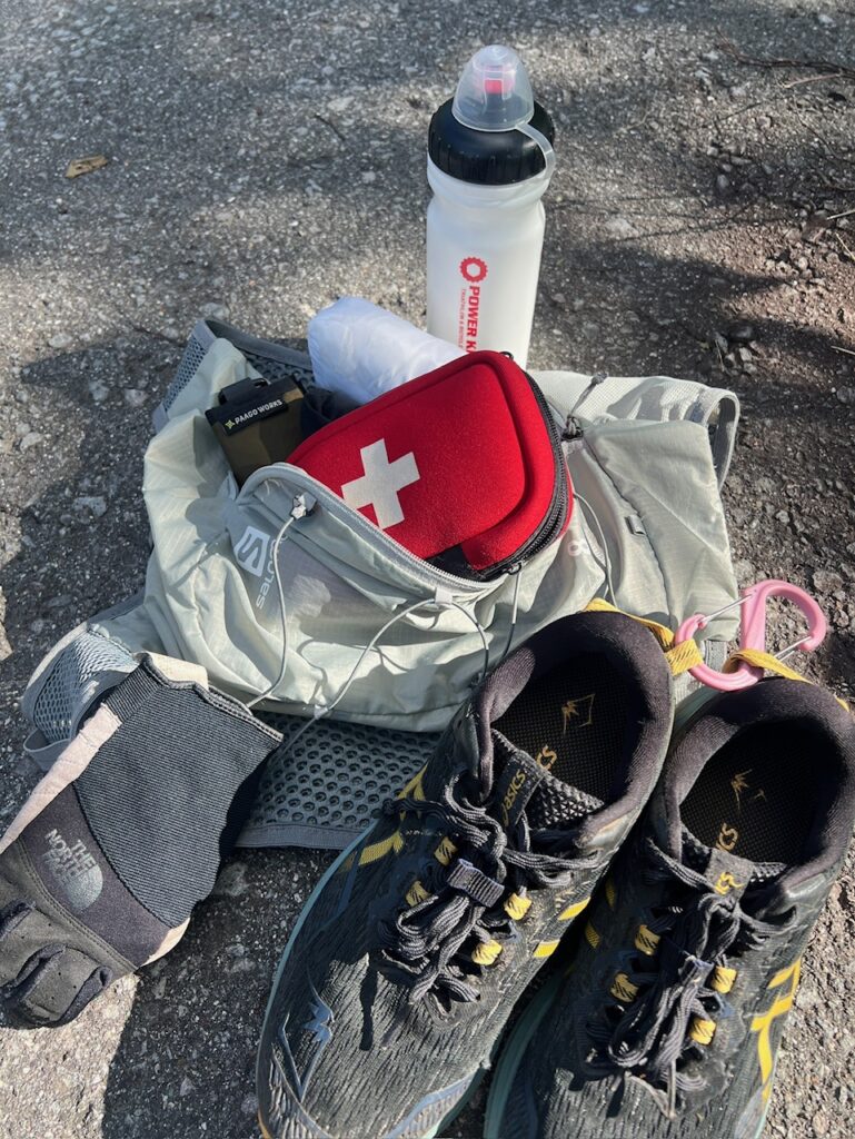 トレラン用ザックにトレランシューズ・軽量レインジャケット・ロングパンツ・救急セット・虫除け用のハッカ油をパッキング(バック)
