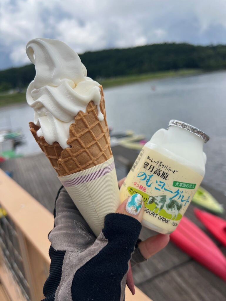 いっぱい動いて遊んだ後は女神湖でりんごのソフトクリームと飲むヨーグルト🍦😋
