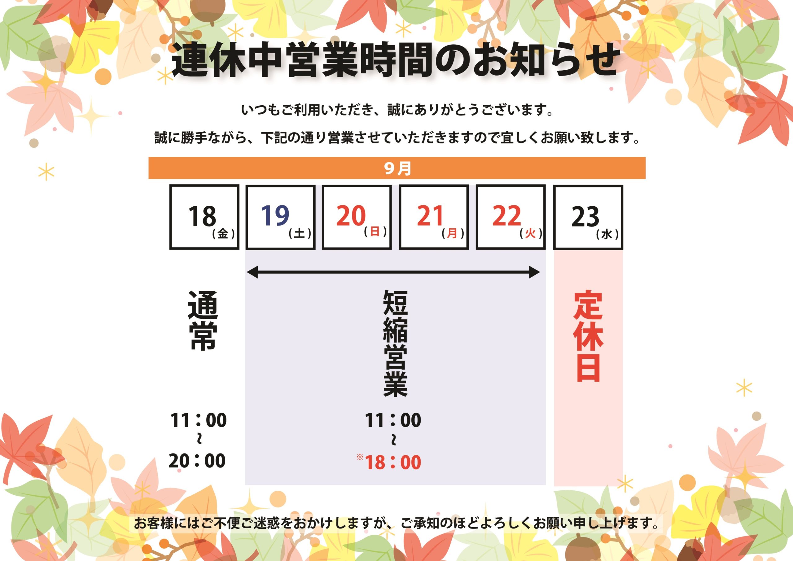 【連休中営業時間のお知らせ】