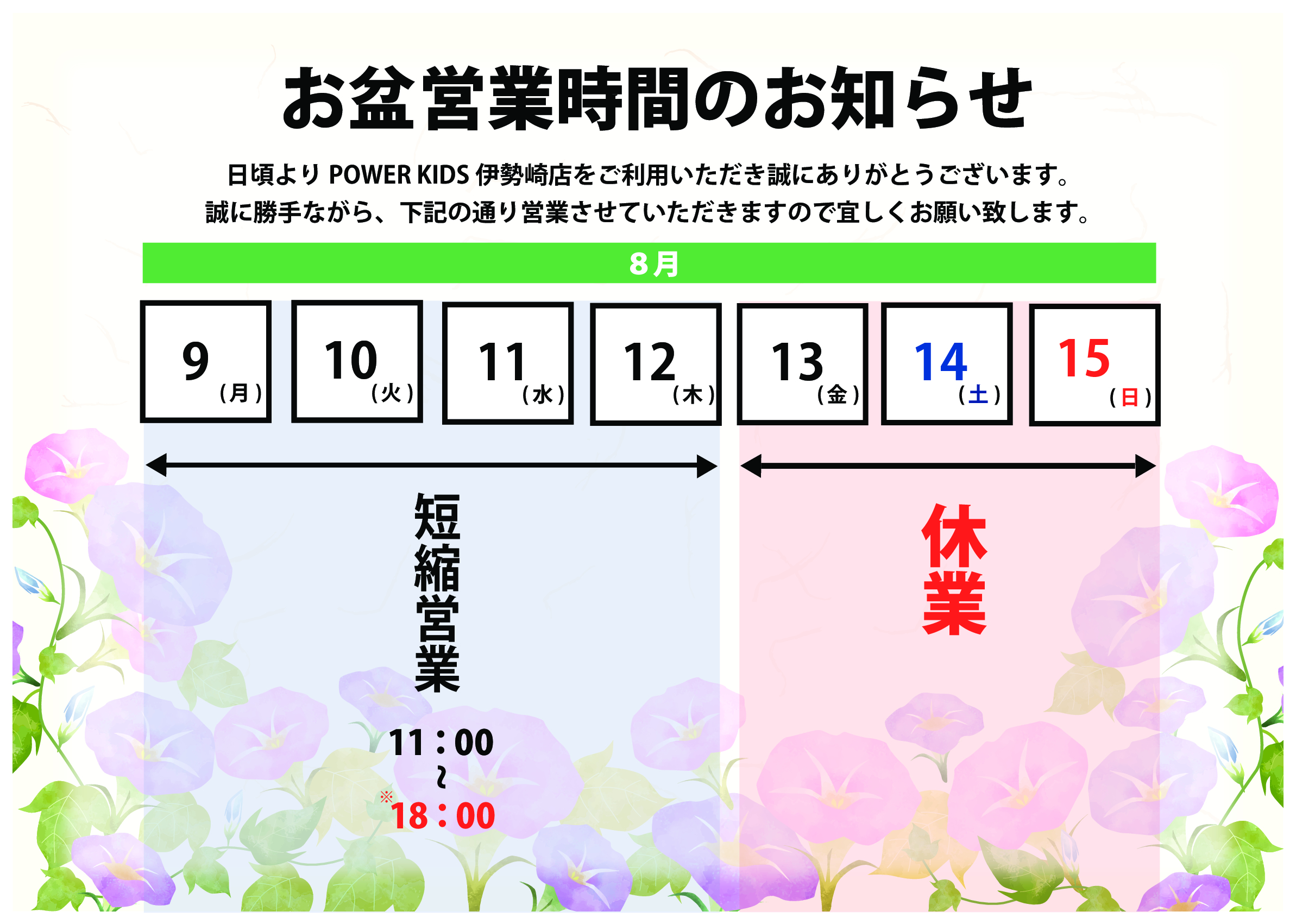 誠に勝手ながら、お盆期間中の営業時間が下記の通り変更となりますのでお知らせいたします。