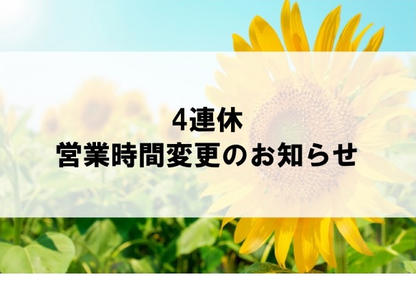 明後日22日(木)から4連休期間中、営業時間が下記の通り変更になりますのでお知らせ致します。
