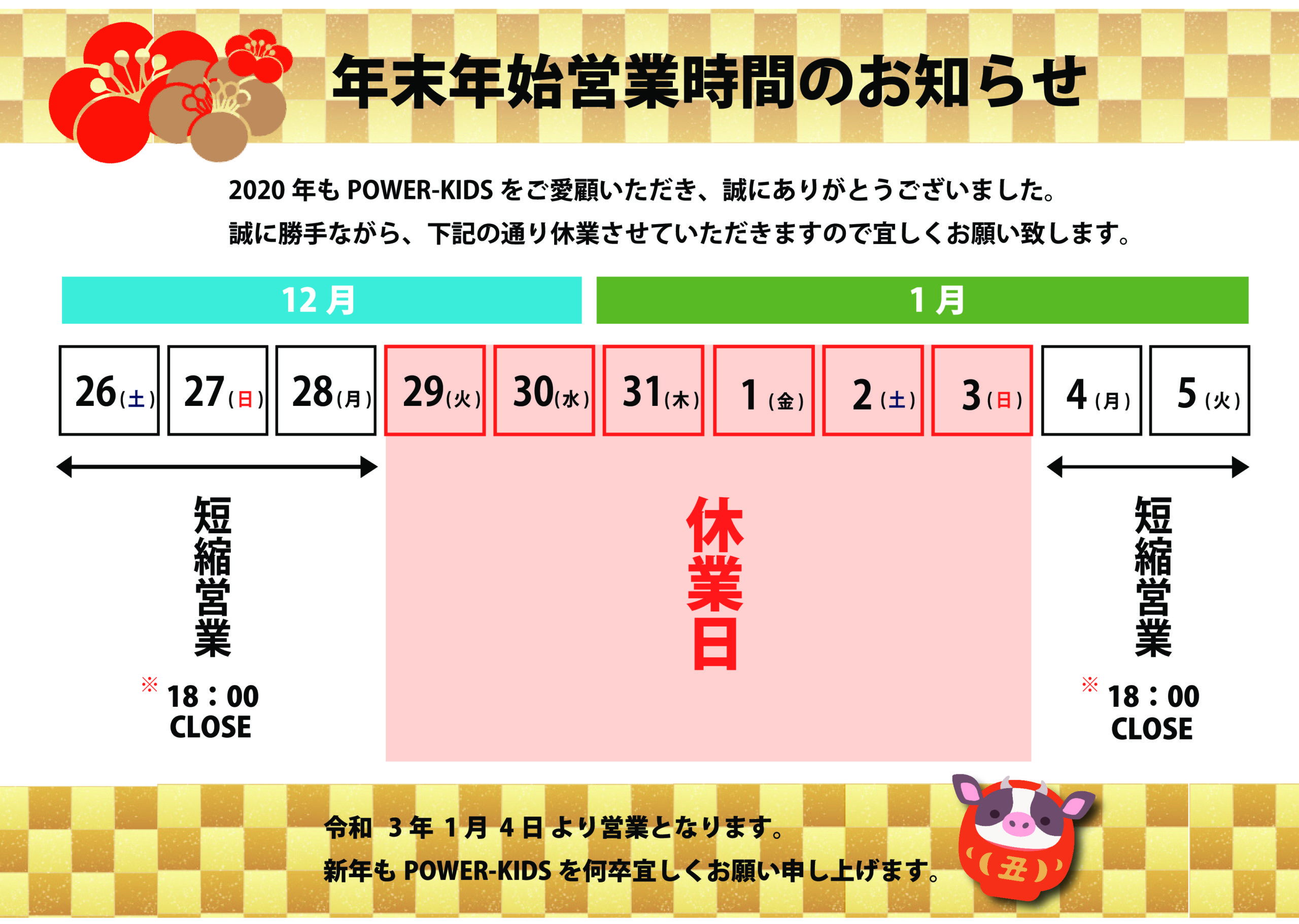 年内の最終営業日は12/28(月)、29(火)~1/3(日)を休業、年始は1/4(月)から営業致します。