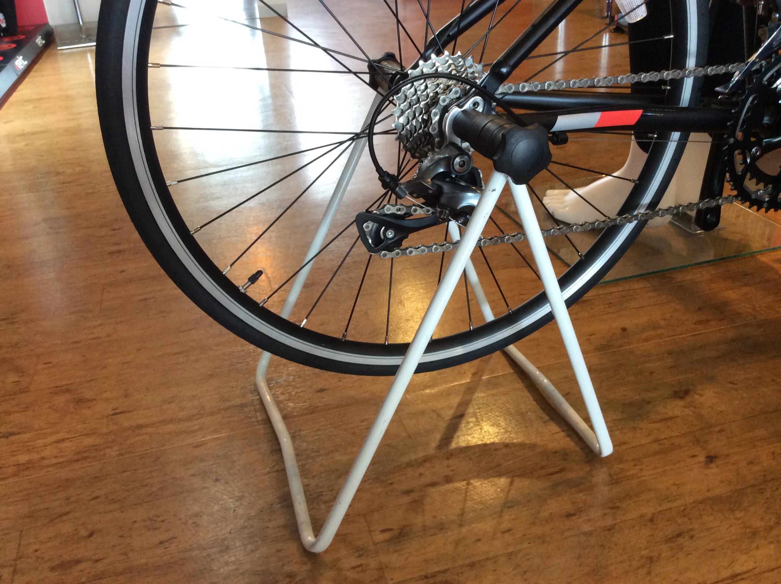 従来のA型スタンドは後輪軸を挟んで固定するので、